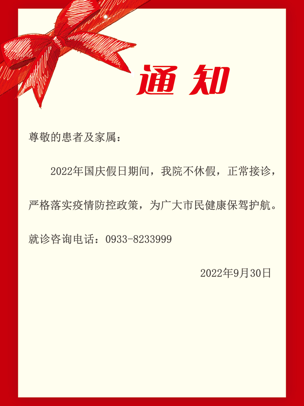 国庆、中秋节期间我院各科室...